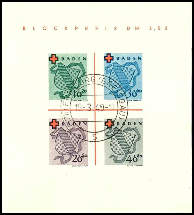 souvenir sheet issue \German Red Cross\, type I, cancelled by red special cancel \Freiburg (Breisgau), Henri Dunant, founder of the Red Cross, 24.6.49\, very fine, unsigned, photo expertize H. D. Schlegel BPP (2018) \the quality is perfect. \, Michel 2.000.- - superb item of the rare issue! (Bl.2I) Certificate Blockausgabe \Deutsches Rotes Kreuz\, Type I, entwertet mit rotem Sonderstempel \Freiburg (Breisgau), Henri Dunant, Gründer des Roten Kreuzes, 24.6.49\, tadellose Erhaltung, unsigniert, Fotoattest H.-D. Schlegel BPP (2018) \Die Qualität ist einwandfrei.\, Mi. 2.000.- - TOP-Stück der seltenen Ausgabe! (Image)