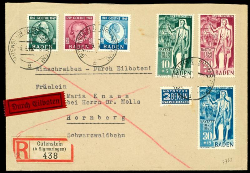 10 plus 5 - 30 plus 15 Pfg Goethe along with 10 to 30 pfennigs Baden revolution on registered letter with a set from Gutenstein to Hornberg. slight traces of transport. expertized Schlegel BPP. Michel lots 220.- (47/52) 10 + 5 - 30 + 15 Pfg Goethe zusammen mit 10 bis 30 Pfennig Badische Revolution auf Einschreibe-Satzbrief von Gutenstein nach Hornberg. Leichte Beförderungsspuren. Geprüft Schlegel BPP. Mi.lose 220.- (Image)