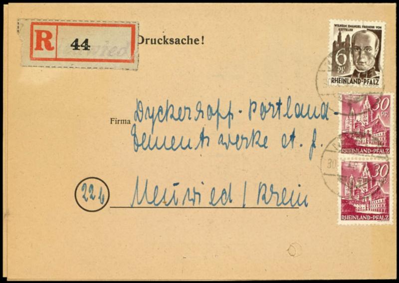 6 Pfg black brown with 2 x 30 Pfg lilac red in issue mixed postage on properly franked rare registered printed matter from NEUWIED 30.7.48 in the local usage, printed folding sheet the trade association the glass industrial (9(2),17) 6 Pfg schwarzbraun mit 2x 30 Pfg lilarot in Ausgaben-MiF auf portogerechter seltener R-Drucksache ab NEUWIED 30.7.48 im Ortsverkehr, gedrucktes Faltblatt der Berufsgenossenschaft der Glas-Industrie (Image)