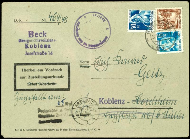 15, 20 and 50 Pfg postal stamps II in mixed franking on affidavit of service Coblenz 22.10.48 to Horchheim, delivery not possible with handwritten reverse \new address unknown\ and returned with reimbursement memo the charges in the amount of 65 Pfg, vertical trace of crease (21,23,26) 15, 20 und 50 Pfg Freimarken II in MiF auf Zustellungsurkunde KOBLENZ 22.10.48 nach Horchheim, unzustellbar mit hs. rs. \Unbekannt verzogen\ und retour mit Erstattungsvermerk der Gebühren in Höhe von 65 Pfg, senkrechte Bugspur (Image)