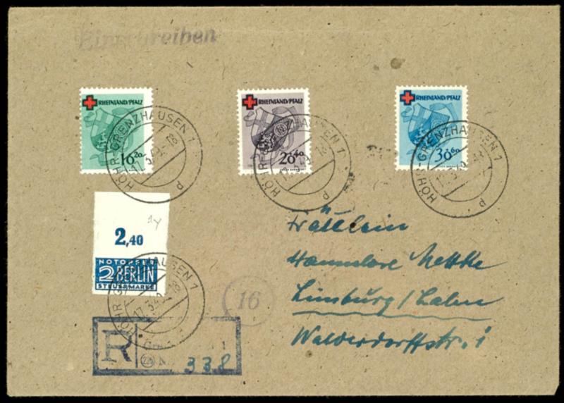 1949, 10, 20 and 30 pfennigs Red Cross on registered cover from \Hoehr Grenzhausen 17.3.49\ to Limbourg, sound, expertized Schlegel BPP. (42/44) 1949, 10, 20 und 30 Pfennig Rotes-Kreuz auf Einschreibebrief von \Höhr Grenzhausen 17.3.49\ nach Limburg, tadellos, geprüft Schlegel BPP. (Image)