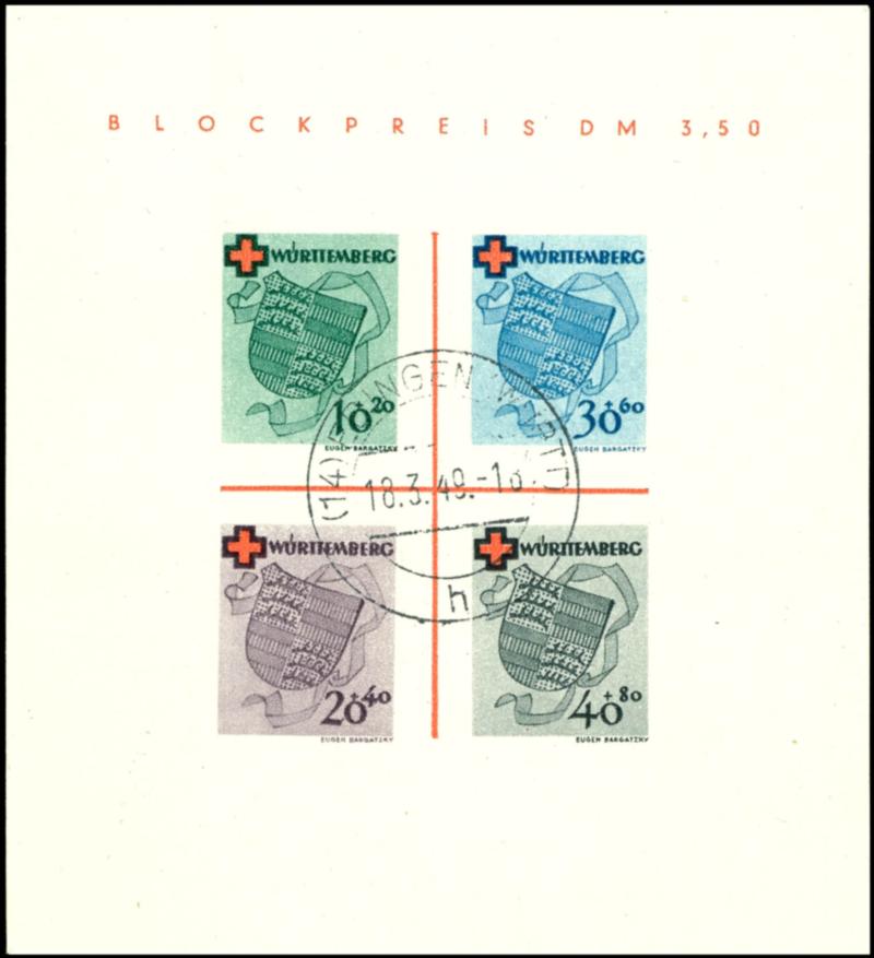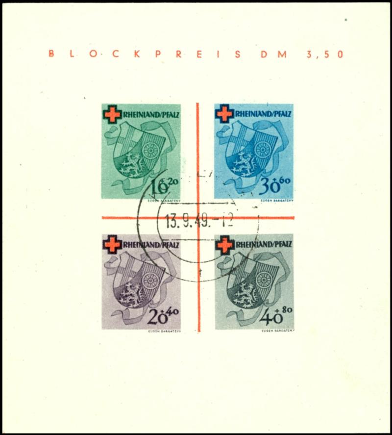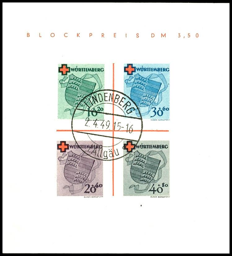 souvenir sheet issue \German Red Cross\, centric cancellation\ (14) Ebingen (Wuertt) h 18.3.49\, very fine, unsigned and photo expertize Hans Dieter Schlegel BPP (2025) \the quality is perfect. \, Michel 1.800.- (Bl.1) Certificate Blockausgabe \Deutsches Rotes Kreuz\, zentrisch gestempelt \(14) Ebingen (Württ) h 18.3.49\, tadellose Erhaltung, unsigniert und Fotoattest Hans Dieter Schlegel BPP (2025) \Die Qualität ist einwandfrei.\, Mi. 1.800.- (Image)