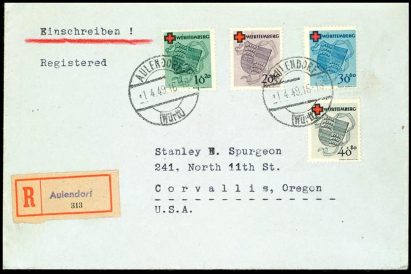 10 plus 20 - 40 plus 80 Pfg completely on registered letter with a set from \Aulendorf 1.4.49\ to the United States. cover with minimal transport traces, expertized Schlegel BPP, Michel 480.- (40/43) 10 + 20 - 40 + 80 Pfg komplett auf eingeschriebenem Satzbrief von \Aulendorf 1.4.49\ in die USA. Umschlag mit minimalen Beförderungsspuren, geprüft Schlegel BPP, Mi. 480.- (Image)