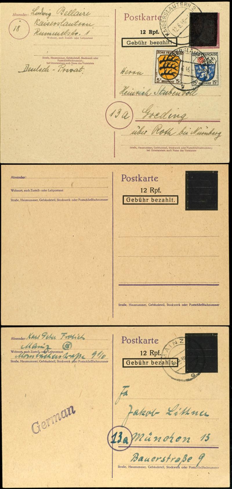 \Hitler\ 6 Pf (PLZ circles, without propaganda imprint) with \12 Rpf charge paid\ overprint, additional postage 5 and 15 Pf French Zone general issue, plus mint and used PG 822, Michel 295.- (PH830a) \Hitler\ 6 Pf. (PLZ-Kreise, ohne Propaganda-Vordr.) mit \12 Rpf. Gebühr bezahlt\-Überdruck, Zusatzfrank. 5 und 15 Pf. Frz. Zone-allgem. Ausgabe, dazu ungebrauchte und gelaufene PG 822, Mi. 295.- (Image)