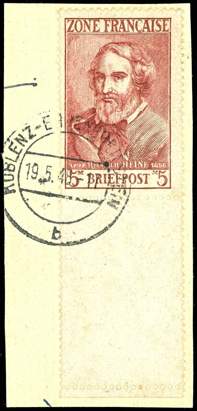 5 M with attached blank space on a postal fragment, perfectly struck with the postmark \Koblenz-Ehrenbreitstein 19. 5. 48\, Michel 220.- (13vL) 5 M. mit anhängendem Leerfeld auf Briefstück, tadellos gest. \Koblenz-Ehrenbreitstein 19.5.48\, Mi. 220.- (Image)