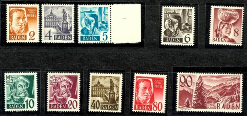 1945-1948, small mint collection, predominantly of the 1st definitive series in a stockbook with general issues, including a marginal block of 40 of number 5, between-print pairs, Baden to Wuerttemberg with types, some printing dates, etc. 1945-1948, kleine postfrische Sammlung, vorwiegend der 1. Dauerserien im Steckbuch mit allgemeine Ausgabe inkl. einer Eckrandeinheit zu 40 Stück der Nr. 5, Zwischenstegpaaren, Baden bis Württemberg mit Typen, einigen Druckdaten usw.