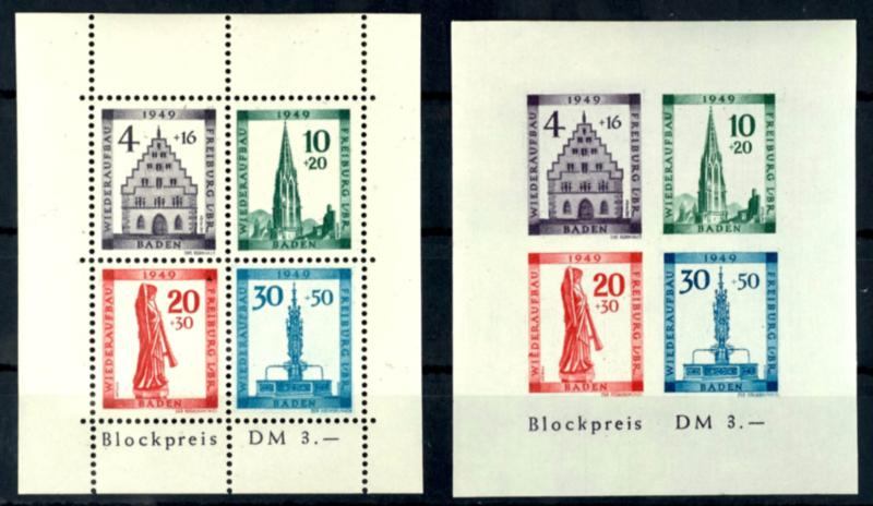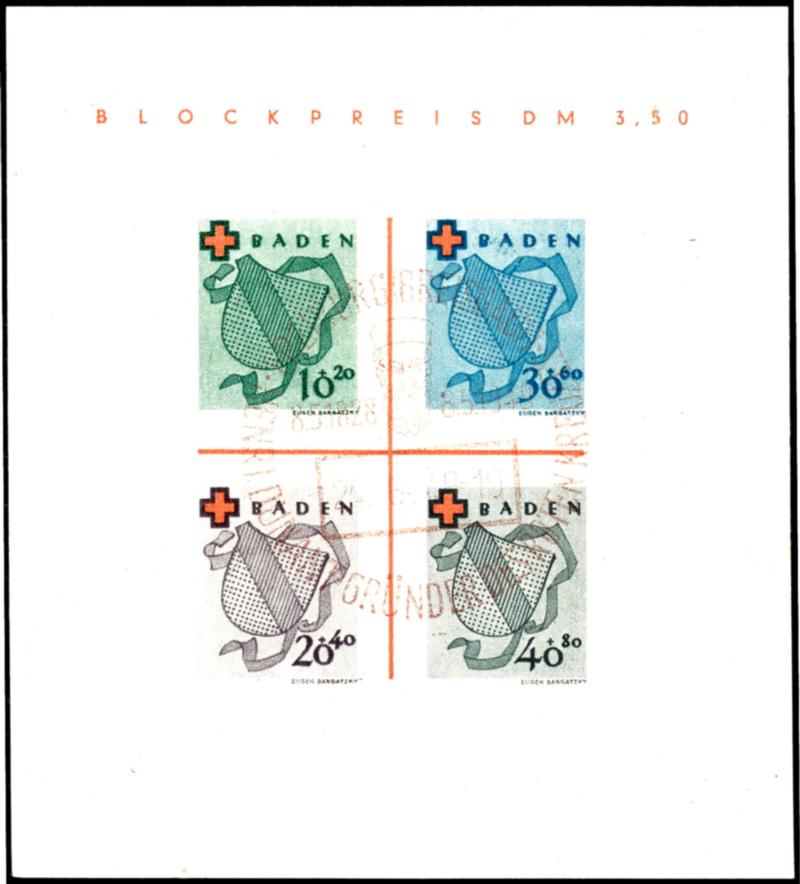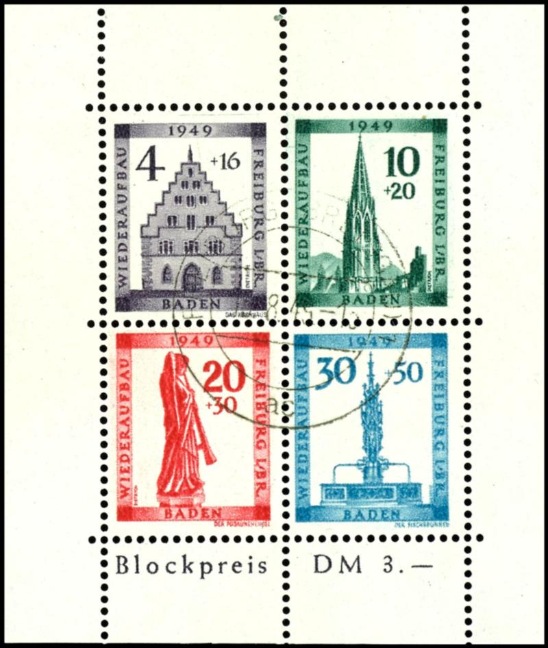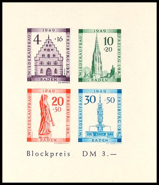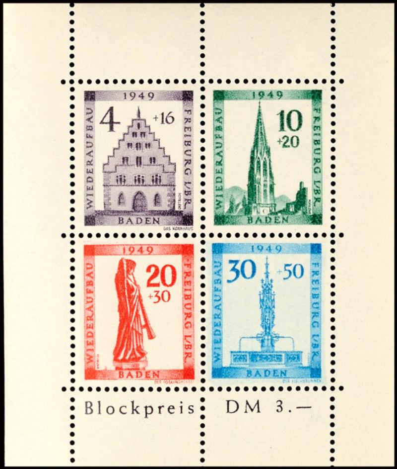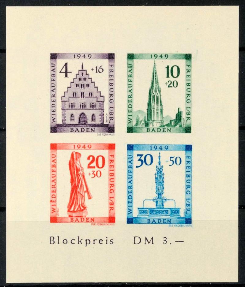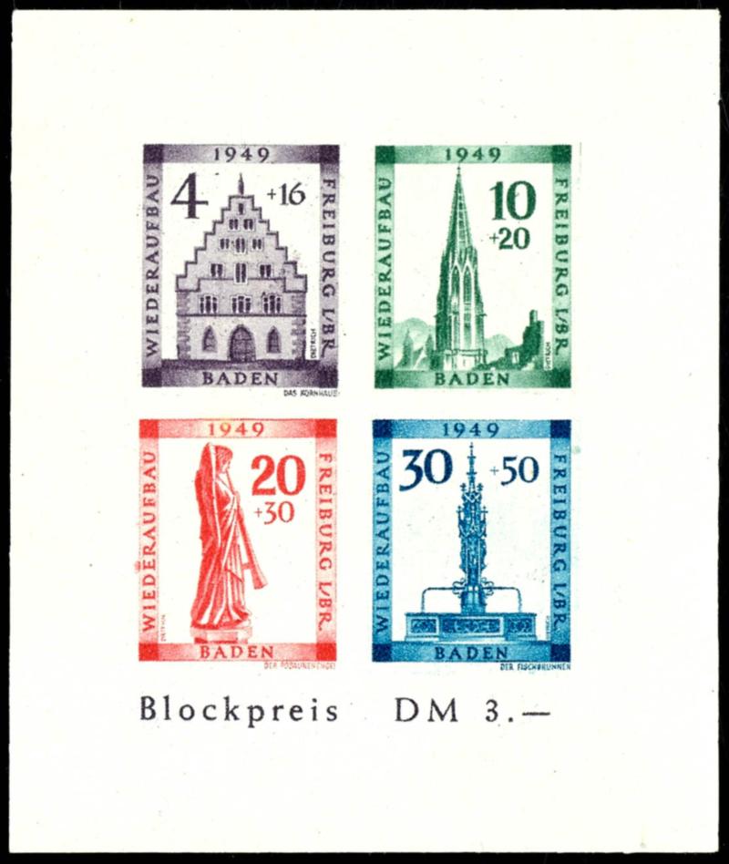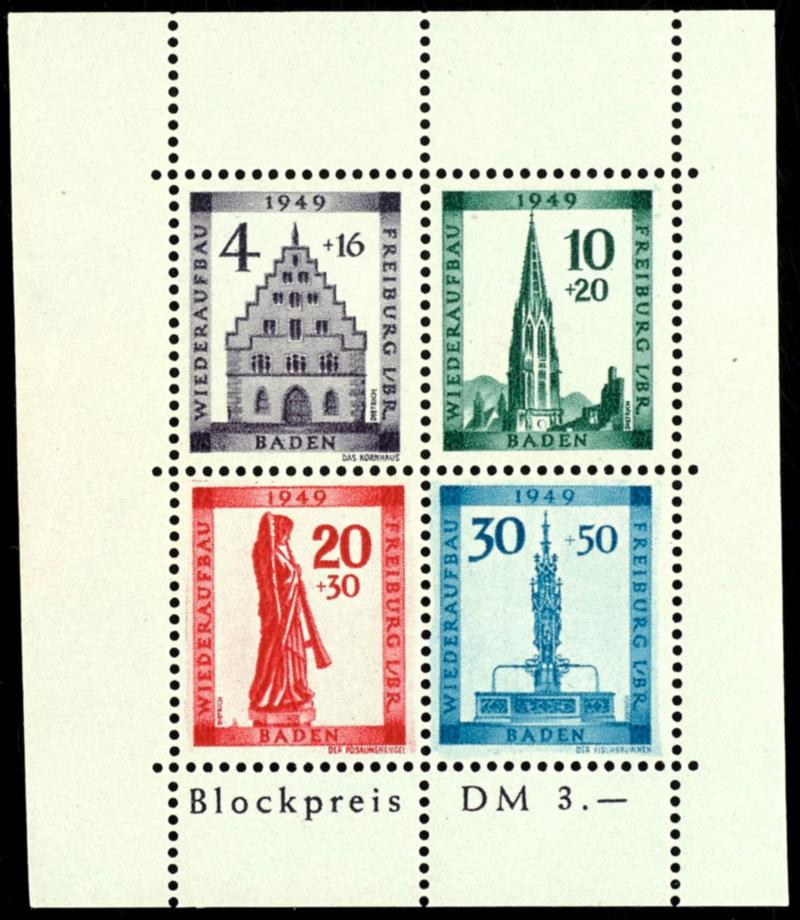 Reconstruction block, cut, Michel number 39 B \Color dot to the left of the B in Baden\, flawless mint never hinged, Michel 300.- (Bl.1BIV) Wiederaufbaublock, geschnitten, Mi.-Nr. 39B \Farbpunkt links neben dem B von Baden\, tadellos postfrisch, Mi. 300.- (Image)
