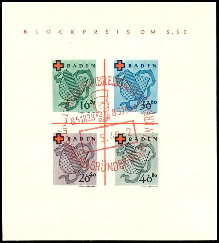 Block issue \German Red Cross\, Type I, cancelled with a red special stamp \Freiburg (Breisgau), Henri Dunant, founder of the Red Cross, June 24, 1949\, flawless condition, unsigned, photo certificate H.-D. Schlegel BPP (2018) \The quality is impeccable.\, Michel 2,000.- - TOP piece of the rare issue! (Bl.2I) Certificate Blockausgabe \Deutsches Rotes Kreuz\, Type I, entwertet mit rotem Sonderstempel \Freiburg (Breisgau), Henri Dunant, Gründer des Roten Kreuzes, 24.6.49\, tadellose Erhaltung, unsigniert, Fotoattest H.-D. Schlegel BPP (2018) \Die Qualität ist einwandfrei.\, Mi. 2.000.- - TOP-Stück der seltenen Ausgabe! (Image)