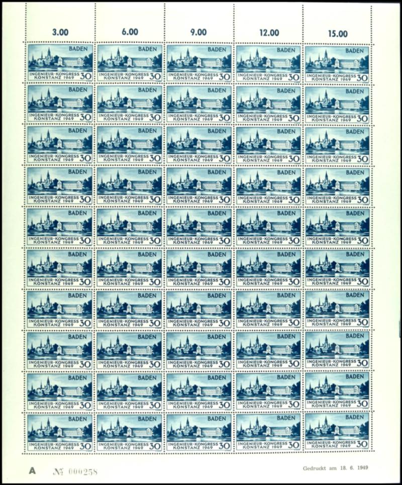 30 Pfennig Constance I, mint complete sheet, minor margin imperfections. (46I) 30 Pfg. Konstanz I, postfrischer kpl. Bogen, kleine Randunebenheiten (Image)