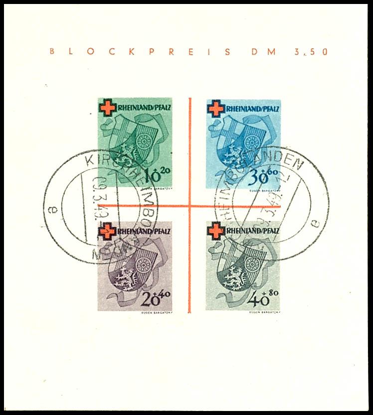 Block issue \Deutsches Rotes Kreuz\ (German Red Cross), Type II / II, postmarked \KIRCHHEIMBOLANDEN 9.3.49\, excellent condition, photo certificate by Hans-Dieter Schlegel BPP: \The quality is flawless.\, Michel value 1,500.- (Bl.1II/II) Certificate Blockausgabe \Deutsches Rotes Kreuz\, Type II/II, gestempelt \KIRCHHEIMBOLANDEN 9.3.49\, tadellose Erhaltung, Fotoattest Hans-Dieter Schlegel BPP \Die Qualität ist einwandfrei.\, Mi. 1.500.- (Image)