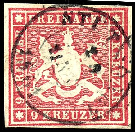 9 Kreuzer Coat of Arms, carmine, with full to wide margins on all sides, cleanly and centrally postmarked \STUTTGART ... 1861\, flawless condition, expertized by Ortel, Michel 100,- (14a) 9 Kreuzer Wappen karmin, allseits voll- bis breitrandig, sauber zentrisch gestempelt \STUTTGART... 1861\, tadellose Erhaltung, geprüft Ortel, Mi. 100,- (Image)