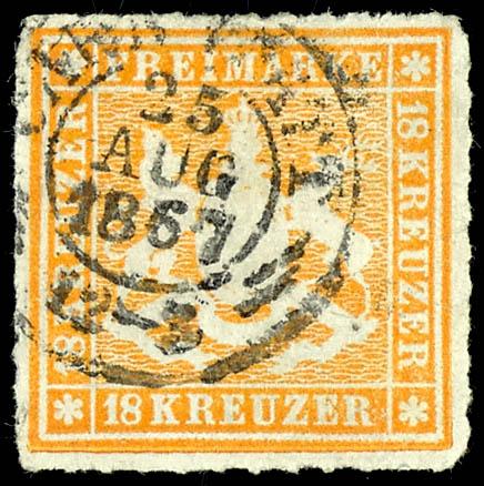 18 Kreuzer Coat of Arms issue, perforated, orange-yellow, used with a double-circle postmark \CANNSTADT 25 August 1867 12-2\, complete perforation all around, very fresh in color with a clear strike, slightly corner rounded as usual, expertized by Richter, photographic finding by Thomas Heinrich BPP (2025), Michel 1. 000.- (34) Certificate 18 Kreuzer Wappenausgabe durchstochen, orangegelb, gestempelt mit Zweikreisstempel \CANNSTADT 25 AUG. 1867 12-2\, ringsum vollständiger Durchstich und sehr schön farbfrisch mit klarer Abstempelung, gering eckrund wie üblich, geprüft Richter, Fotobefund Thomas Heinrich BPP (2025), Mi. 1.000.- (Image)