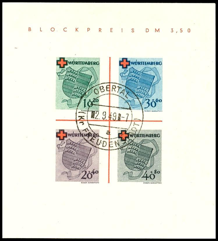 Block issue \German Red Cross\, centrally struck with \Obertal (Dist. Freudenstadt) 2. 9. 49\, flawless condition, photo certificate Hans-Dieter Schlegel BPP \The condition is flawless.\, Michel 1. 800.- (Bl.1) Certificate Blockausgabe \Deutsches Rotes Kreuz\, zentrisch gestempelt \Obertal (Kr. Freudenstadt) 2.9.49\, tadellose Erhaltung, Fotoattest Hans-Dieter Schlegel BPP \Die Erhaltung ist einwandfrei.\, Mi. 1.800.- (Image)