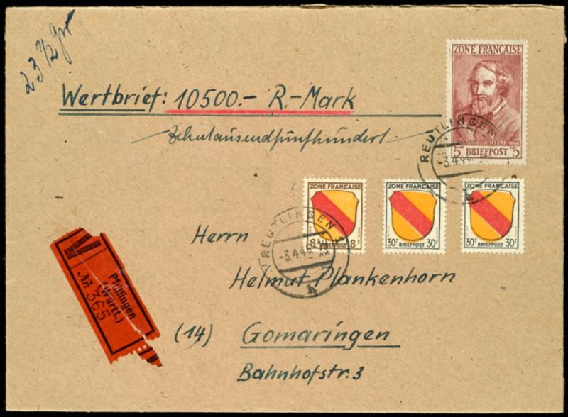 5 Mark Heine with 8 and 2 x 30 Pfg coat of arms on properly franked insured letter over 10.500 Mark from REUTLINGEN 3.4.46 to Gomaringen, arrival 5.4.46, superb (13,10(2),4)