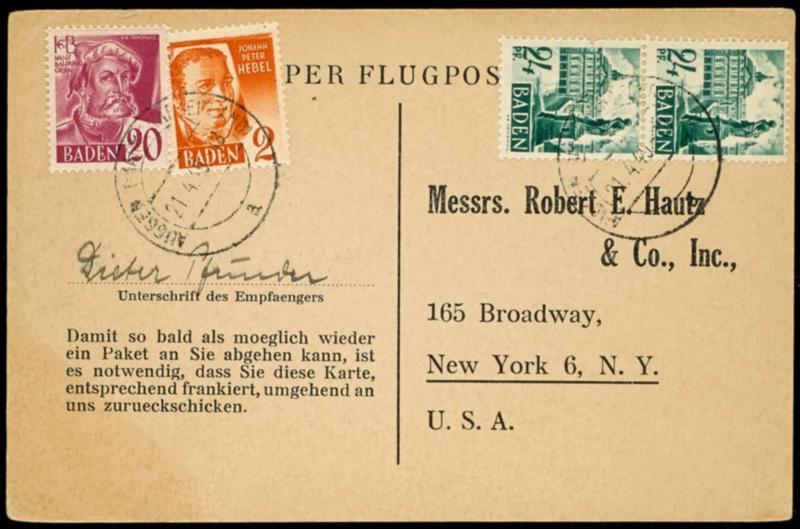 2 and 2 x 24 Pfg postal stamps II with 20 Pfg postal stamps III on properly franked oversea airmail card AUGGEN (MARKGRAEFLERLAND) 21.4.49 to New York, printed form card in appreciation of the audience of a Care package, superb (14,22(2),34)