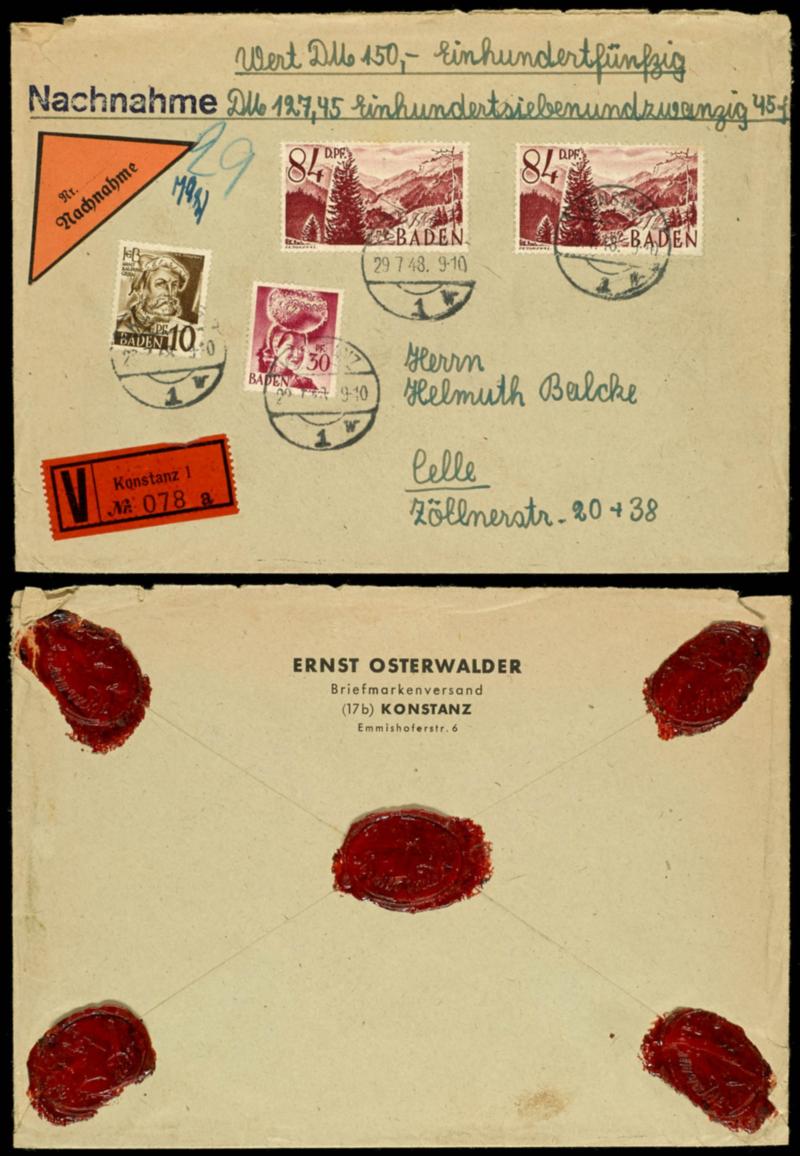 2 x 84 Pf with 10 and 30 Pfg on exactly properly franked COD insured letter over 150 Mark with 70 g weight from Constance 29.7.48 to Celle, superb (26(2),23,17)