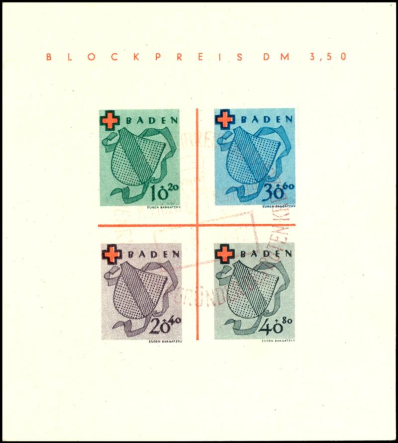 Blockausgabe Rotes Kreuz, Type I, gestempelt "FREIBURG (BREISGAU) 19.3.49", tadellose Erhaltung, unsigniert, Fotoattest Hans-Georg Schlegel BPP "Die Erhaltung ist einwandfrei.", Mi. 1.500.- (Image 1)(Image)