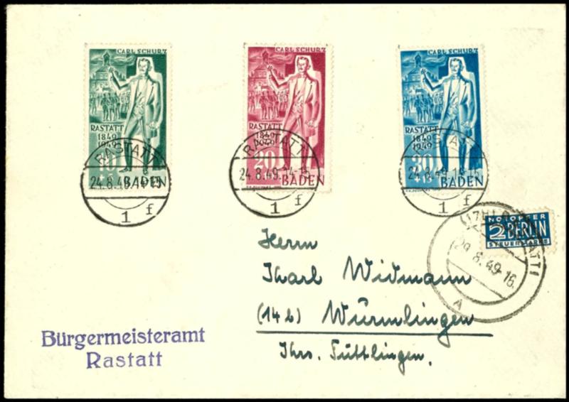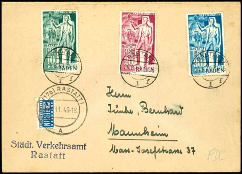 10 pfennigs to 30 pfennigs Carl Schurz, complete set on cover with first day postmark "RASTATT 24.8.49", superb, Michel 160.- (50/52)