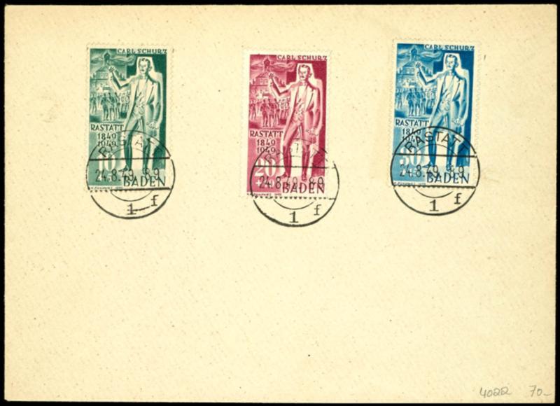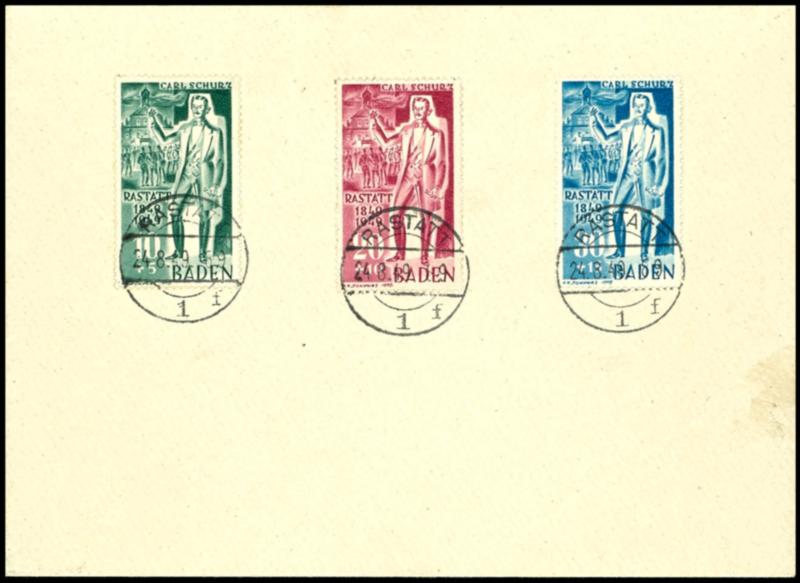 10 Pfennig bis 30 Pfennig Carl Schurz, kompletter Satz auf Brief mit Ersttagsstempel "RASTATT 24.8.49", Pracht, Mi. 200.- (Image 1)(Image)