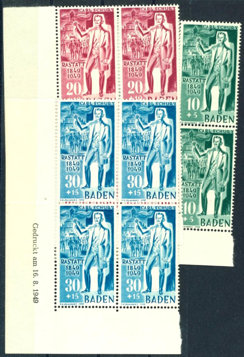 10 pfennigs to 30 pfennigs Carl Schurz, block of four from the sheet corner set lower left with date of printing, mint never hinged, very fine, Michel 285.- plus (50/52(4)Bru)