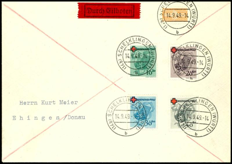 10 Pfennig bis 40 Pfennig Rotes Kreuz, kompletter Satz mit vier Werten auf überfrankiertem Eilboten-Brief von "SCHELKLINGEN 14.9.49" nach Ehingen/Dona mit rückseitigem Ank.-Stempel vom gleichen Tag, Fotobefund Schlegel BPP, Mi. lose 440.- (Image 1)(Image)
