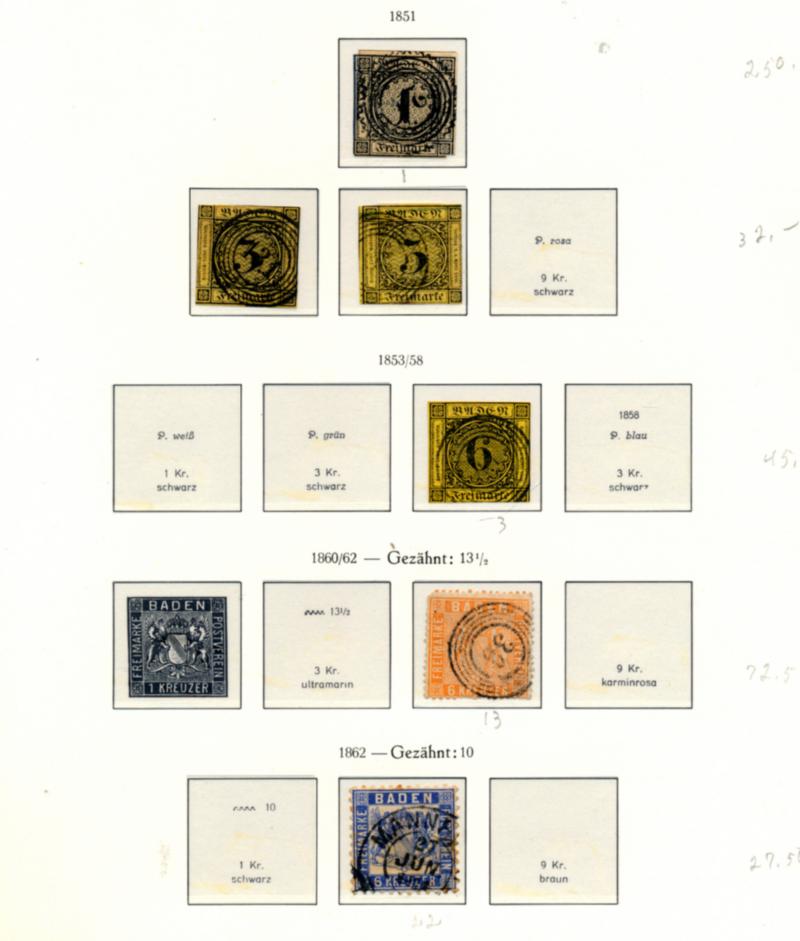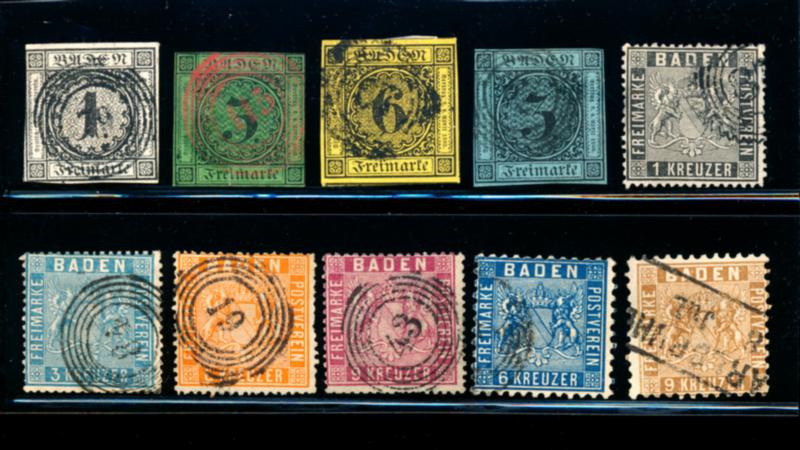 GERMAN STATES BADEN 1853-62 SELECTION STAMPS VG-VF /O Baden Numeral and Coat of Arms issues, selection of 4 stamps imperforated and 5 stamps perforated, all nicely canceled. Numbers are: #6, margins touching frame at top and bottom left, #7, light thins and small margins all around touching frame at right, #8, 4 margins, #9, small margins touching frame at left, #10, light thins, #12, #13, #14, #16 and #17. Scott $950.00 CAD. (Image1)