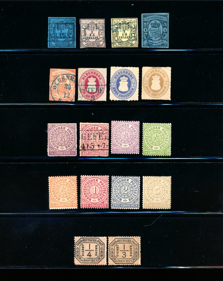 GERMAN STATES 1852-1870 SELECTION STAMPS F-VF */**/O. Oldenburg and North German Confederation issues, selection of 18 mint and canceled stamps. Numbers are: Oldenburg #1-3/o, 6/o (thinned), 14/o (thinned), 23/o, 24*, 25*(thinned), #1 to 14 are imperforate and #23 to 25 are rouletted, North German Confederation #1*, 4/o, 13-18** and O1(*), O2(*)(thinned), #1 and 4 are rouletted and the other are perforated. Scott $1280.00 CAD. (Image1)