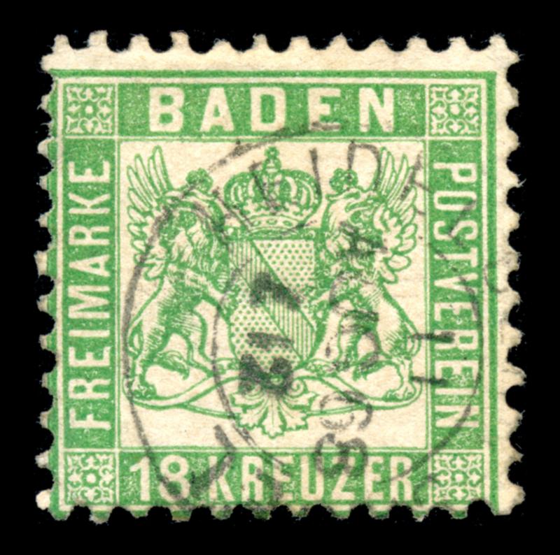 GERMAN STATES BADEN 1862 #24 STAMP F-VF /O Baden 18 Kreuzer Coat of Arms, the stamp is nicely canceled and without fault. Scott $775.00 CAD, Michel #21, 700 Euros ($1100.00). (Image1)