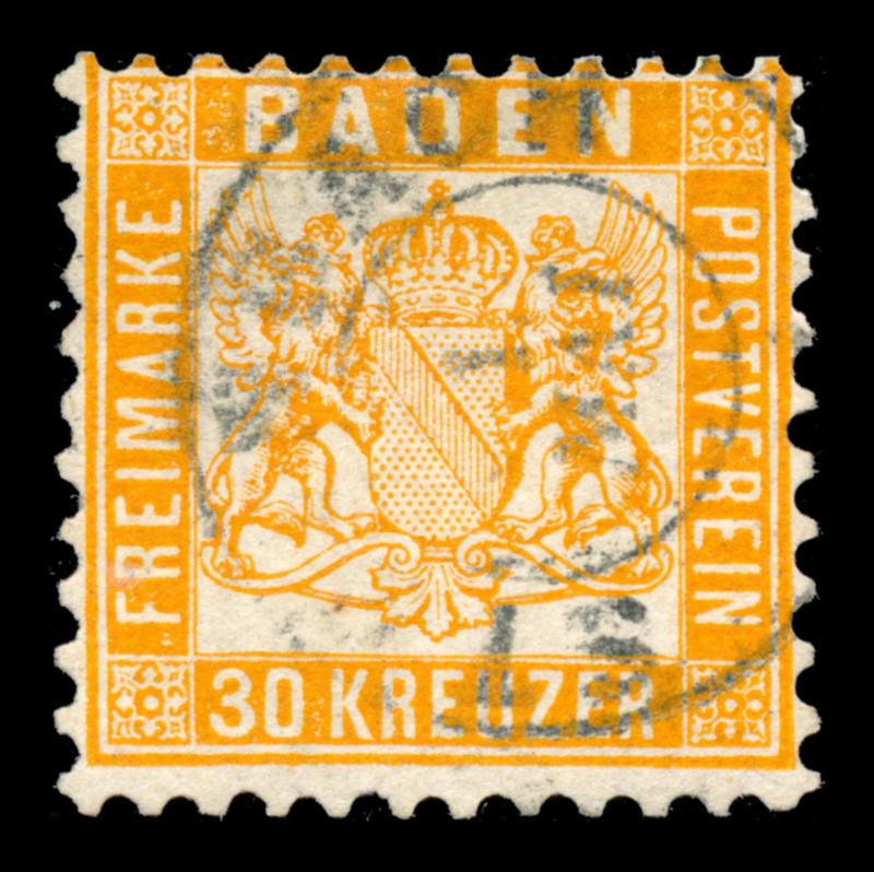 GERMAN STATES BADEN 1862 #25 STAMP F-VF /O Baden 30 Kreuzer Coat of Arms, the stamp is imperforate, nicely canceled and without fault. Scott $3000.00 CAD, Michel #22, 3200 Euros ($5100.00). (Image1)