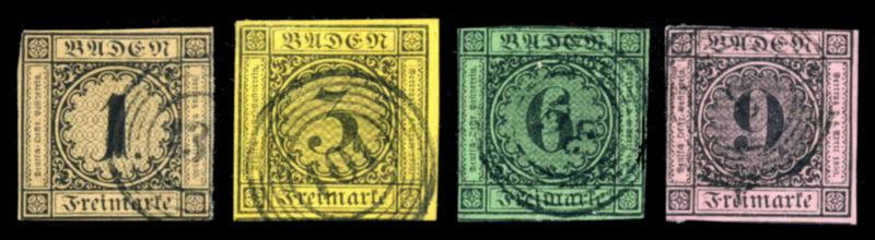GERMAN STATES BADEN 1851-52 SELECTION STAMPS F-VF /O Baden Numeral, selection of 4 stamps imperforated and nicely canceled. Numbers are: #1a thin paper, small margins touching frame at top and bottom left, #2 thick paper, 4 clear margins, light thin at top left, #3a thin paper, margins touching frame all around and light thin at bottom, #4a thin paper, margins touching frame at left and top. Scott $1430.00 CAD. (Image1)