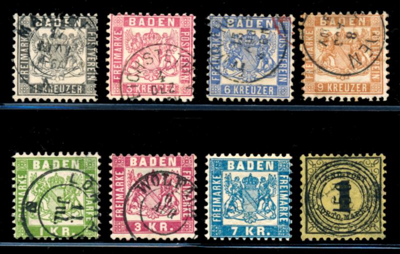 GERMAN STATES BADEN 1862-68 SELECTION STAMPS F-VF */O. Baden Numeral and Coat of Arms issues, selection of 8 stamps nicely canceled. Numbers are: #19, #20, #22 small thin top left, #23, #24, #26, #27, #28* and #LJ1 Postage Due. Scott $1030.00 CAD. (Image1)