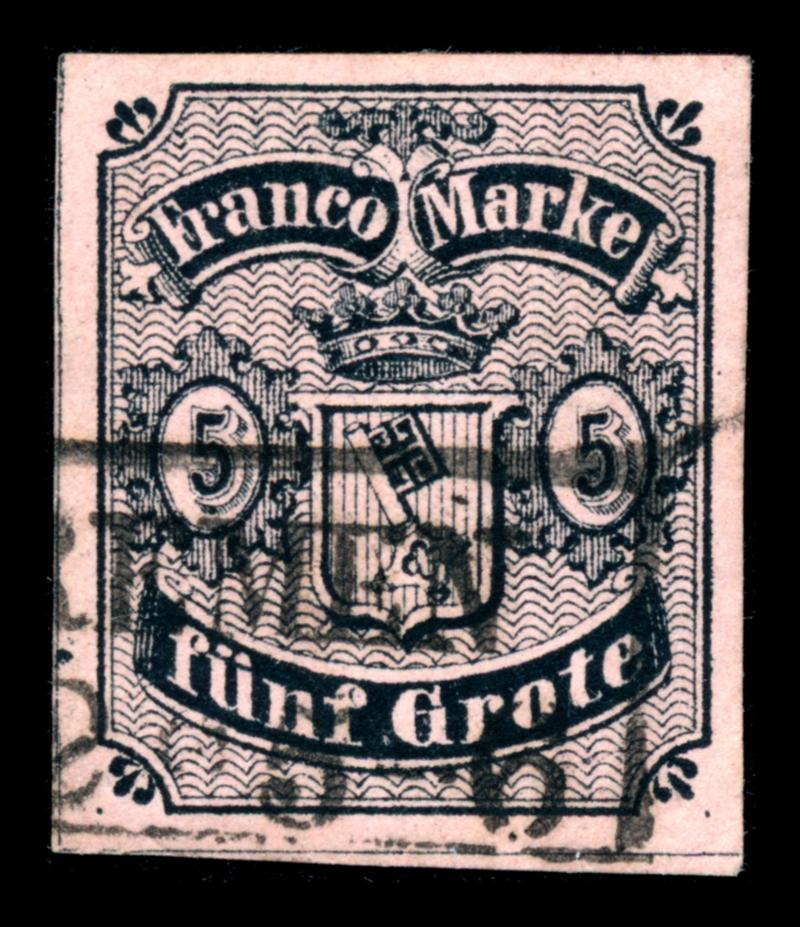 GERMAN STATES BREMEN 1856 #2 STAMP VF /O. Bremen Coat of Arms issue, 5 Grote black on rose, imperforate with 4 clear margins and nicely canceled. Scott $410.00 CAD. (Image1)