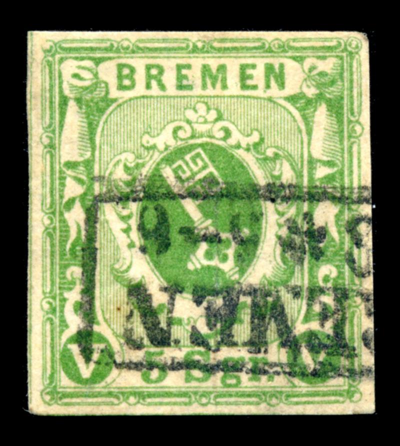 GERMAN STATES BREMEN 1859 #4 STAMP VF /O. Bremen Coat of Arms issue, 5 Silber groschen green, imperforate with 4 clear margins and nicely canceled. Scott $410.00 CAD. (Image1)