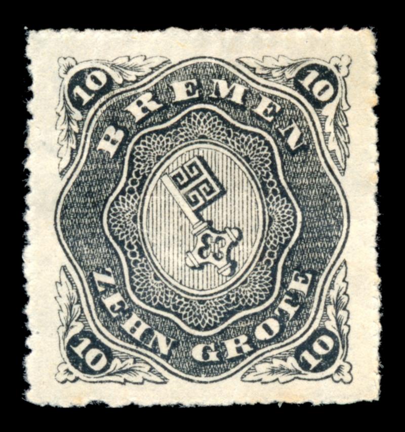 GERMAN STATES BREMEN 1861 #7 STAMP VF (*). Bremen Coat of Arms Issue, 10 Grote black mint hinged and serrated "serpentine roulette". Scott CAD $945.00. (Image1)