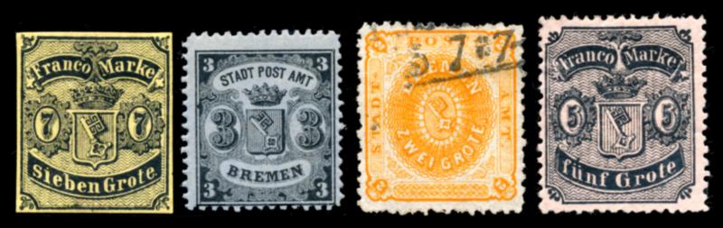 GERMAN STATES BREMEN 1860-66 SELECTION STAMP F-VF */O. Bremen Coat of Arms Issue, selection of 4 stamps. The numbers are: #3*, #10*, #11/o, and #12*. The stamps are in good condition. Scott $730.00 CAD. (Image1)