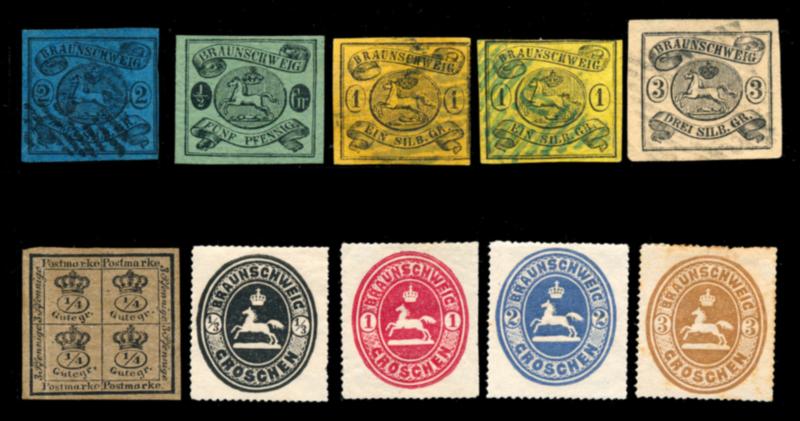 GERMAN STATES BRUNSWICK 1853-65 SELECTION STAMPS F-VF */O. Brunswick "leaping Saxon Horse" and Coat of Arms issues, selection of 10 stamps mint and canceled. Numbers are: #2/o, #6(*), #7/o, #8/o, #10/o, #12(*) and #23-26*. Stamps #2 to #12 are imperforated, #2 is unwatermarked and #6 to #12 are watermarked, #23-26 are rouletted and unwatermarked. Scott $750.00 CAD. (Image1)