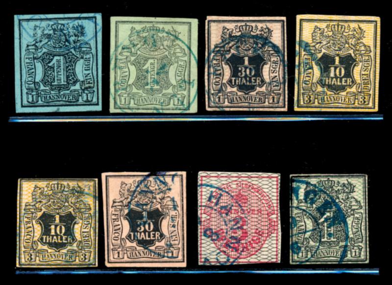 GERMAN STATES HANOVER 1850-56 SELECTION STAMPS F-VF /O. Hanover Crown and Coat of Arms Issues, selection of 8 imperforate and lightly canceled stamps. Numbers are: #1-3, #6, #8-9, #11-12. The stamps are without any faults. Scott $875.00 CAD. (Image1)