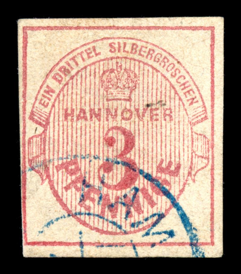 GERMAN STATES HANOVER 1853 STAMP VF /O. Hanover Crown and Numeral Issue, 3 Pfennigs rose imperforate with a narrow margin at bottom left and lightly canceled. The stamp is signed on back by German expert Pfenninger. Scott $410.00 CAD. (Image1)