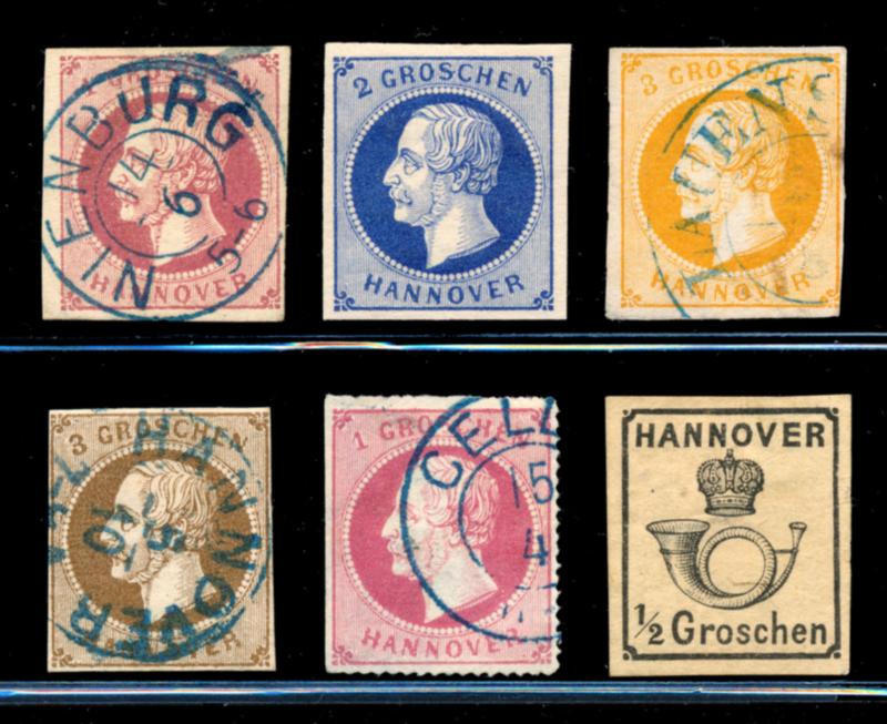 GERMAN STATES HANOVER 1859-64 SELECTION STAMPS F-VF */(*)/O. Hanover King George V and Crown and Post Horn Issues, selection of 5 imperforate mint and canceled stamps plus 1 perforate canceled stamp. Numbers are: #18(*), #19/o, 20*, 22a/o, 23/o and #27/o. Scott $400.00 CAD. (Image1)