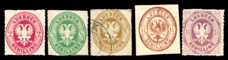 GERMAN STATES LUBECK 1863-65 SELECTION STAMPS F-VF */(*)/O. Lubeck Coat of Arms Issues, selection of 4 perforate mint and canceled stamps plus 1 imperforate mint stamp. Numbers are: #10(*), #11*, #12/o, #13(*) and #14*. Scott $440.00 CAD. (Image1)