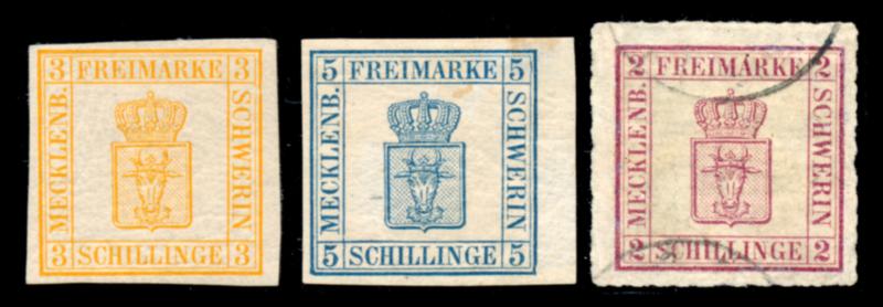 GERMAN STATES MECKLENBURG-SCHWERIN 1856-66 SELECTION STAMPS VF */O. Mecklenburg-Schwerin Coat of Arms issue, selection of 3 very nice stamps. Numbers are: #2*, imperforate, 4 margins, full gum and signed on back by Georg Buhler Expert, #3*, imperforate, 4 margins and full gum and #6a/o and rouletted 11 1/2. Scott $760.00 CAD. (Image1)