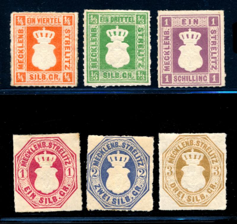 GERMAN STATES MECKLENBURG-STRELITZ 1864 SET #1-6 STAMPS F-VF *. Mecklenburg-Strelitz Coat of Arms issue, set of 6 mints lightly hinged stamps and rouletted 11 1/2. Numbers 1 and 3 are signed on back by Aimé Brun Expert. Scott $900.00 CAD. (Image1)