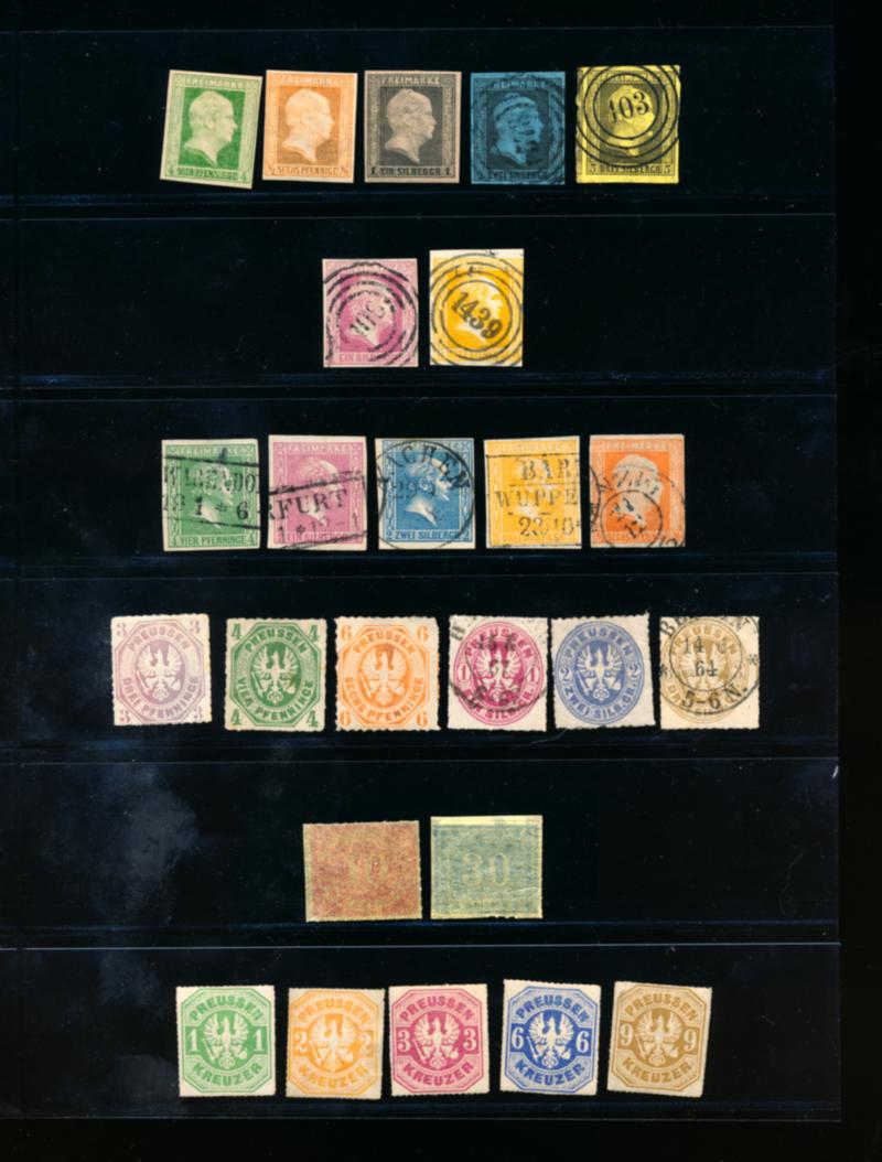 GERMAN STATES PRUSSIA 1850-67 SELECTION STAMPS F-VF */O. Prussia collection of 25 mint and canceled stamps. Numbers are: #1-3* and #4-5/o, imperforate, 4 margin and watermarked, #9-13/o, imperforate, 4 margins and without watermark, #14-19*, #17/o, #18* and 20/o. Numbers #14 to 20 are embossed and rouletted 11 1/2, #21-22* rouletted 10 and #23-27* embossed and rouletted 16. Scott $1415.00 CAD. (Image1)