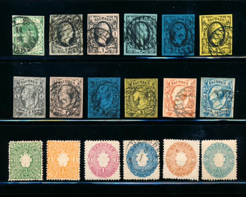GERMAN STATES SAXONY 1851-63 SELECTION STAMPS F-VF */O. Saxony selection of 18 mint and canceled stamps. Numbers are: #2-14/o, imperforate with 4 margins, #15-17*, #18/o and 19-20*. Numbers #15 to 20 are embossed and rouletted 10. Scott $900.00 CAD. (Image1)