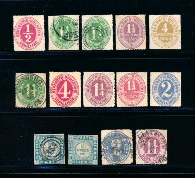 GERMAN STATES SCHLESWIG-HOLSTEIN 1864-65 SELECTION STAMPS F-VF */O. Schleswig-Holstein selection of 14 mint and canceled stamps. Numbers are: 3(*), 4/o x2, 5*, 7(*), 8/o, 9*(thinned), 11(*), 12*, 13*, 15/o imperforate with 3 margins only, 16* imperforate with 4 small margins, 21/o, 22/o. Scott $1850.00 CAD. (Image1)