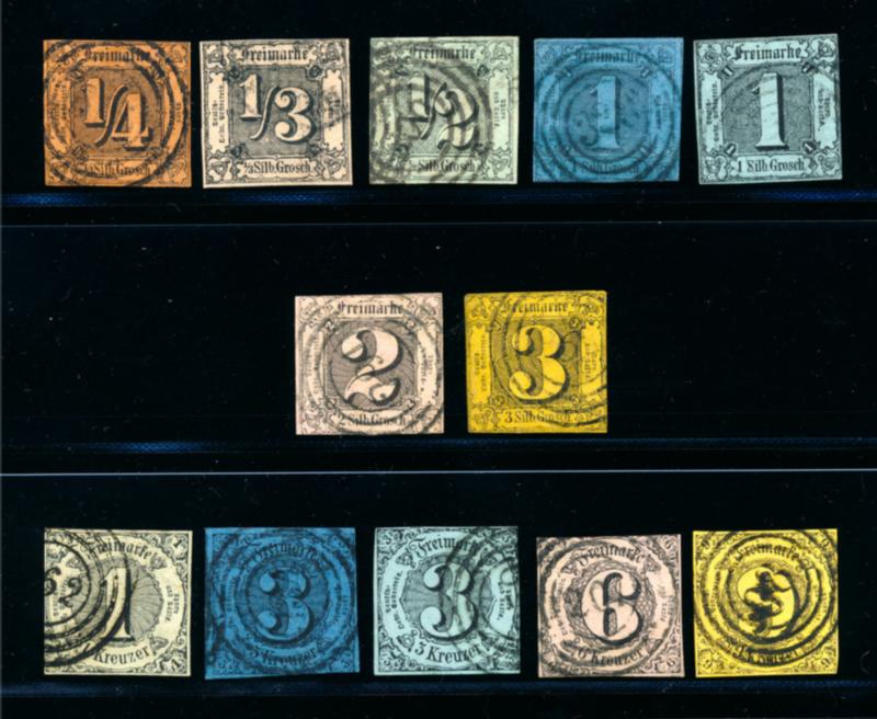 GERMAN STATES THURN AND TAXIS 1852-53 SELECTION STAMPS F /O. Thurn and Taxis selection of 12 canceled stamps. Numbers are: #1-7 and #42-46, #1 and #2 with light thin on top and #4 thinned. Scott $930.00 CAD. (Image1)