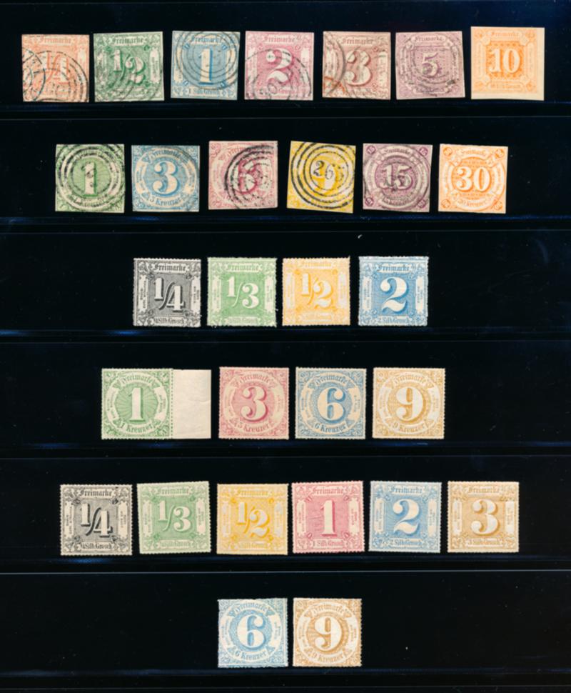 GERMAN STATES THURN AND TAXIS 1859-66 SELECTION STAMPS F */**/O. Thurn and Taxis issues, selection of 29 mint and canceled stamps. Numbers are: #8-13/o, 14**, 21-23**, 25*, 27-32**, 47-51/o, 52**, 58-63**. Scott $1620.00 CAD. (Image1)
