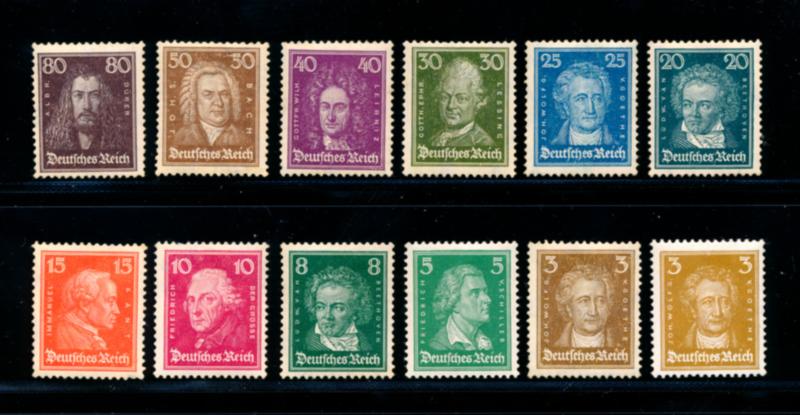 GERMANY 1926-27 #351-62 STAMPS F **. Celebrities issue, complete set of 12 stamps mint never hinged. Scott $1200.00 CAD. (Image1)