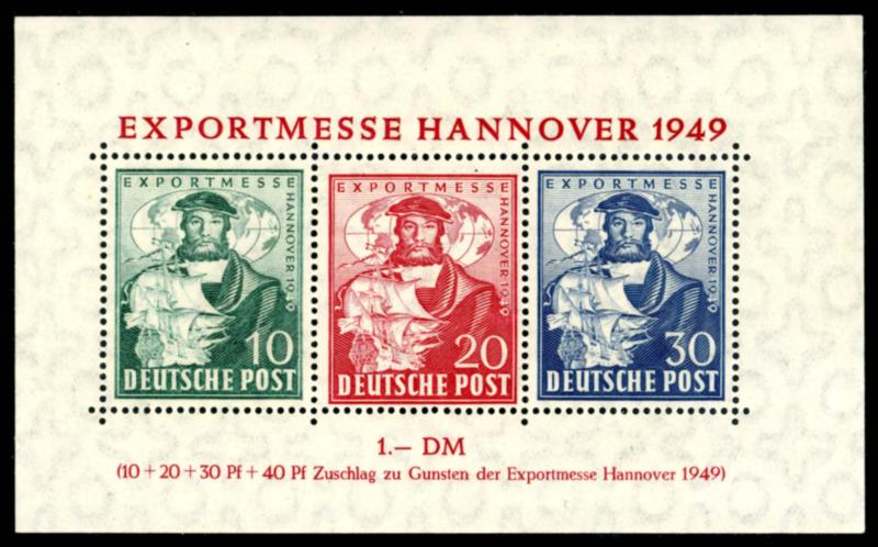 GERMANY 1949 #664a S/S F-VF **. Hanover Export Fair issue, mint never hinged souvenir sheet of 3 stamps signed Schlegel on back. Scott $145.00 CAD. (Image1)