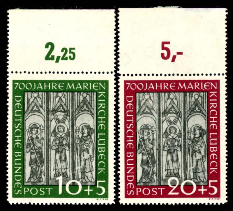 GERMANY 1951 #B316-17 STAMPS XF **. Reconstruction of Marienkirche, superb set of 2 stamps mint never hinged with top numbered margins. Scott $240.00 CAD. (Image1)